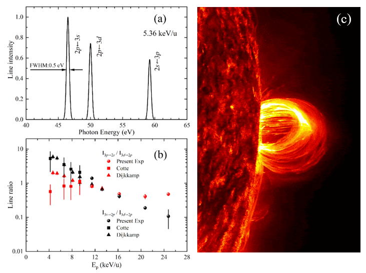 圖:(a-b) 實驗所得N5+與He電荷交換EUV譜線和線強比;(c) 日冕物質拋射示意圖