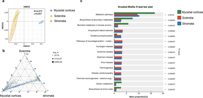 中國(guó)科學(xué)院西北高原生物研究所青藏高原植物適應(yīng)與進(jìn)化研究團(tuán)隊(duì)研究鑒定出4,561個(gè)細(xì)菌OTU,其中2980個(gè)為稀有類(lèi)群(相對(duì)豐度<0.01%)。宏基因組分析顯示,外部菌絲皮層富集576個(gè)代謝通路(如碳代謝、次級(jí)代謝產(chǎn)物合成),顯著高于菌核(117個(gè))和子座(0個(gè))。稀有類(lèi)群雖豐度低,但貢獻(xiàn)了關(guān)鍵物質(zhì)循環(huán)基因(如氮代謝基因narG、nosZ),提示其具有“功能庫(kù)”作用。共現(xiàn)網(wǎng)絡(luò)分析揭示,外部菌絲皮層微生物呈現(xiàn)獨(dú)特的模塊化結(jié)構(gòu),Proteobacteria和Bacteroidetes形成高連接度核心網(wǎng)絡(luò)。該區(qū)域特異性富集Caballeronia、Dyella等具有降解功能的細(xì)菌屬,可能在昆蟲(chóng)幼蟲(chóng)分解和宿主防御中發(fā)揮屏障作用。通過(guò)優(yōu)化培養(yǎng)組培養(yǎng)體系,成功分離52株細(xì)菌(覆蓋26屬40種),包括8個(gè)高通量測(cè)序未檢出的菌株(如Plantibacter、Tardiphaga)。81.2 %的目級(jí)類(lèi)群實(shí)現(xiàn)可培養(yǎng),為后續(xù)功能驗(yàn)證和資源利用奠定基礎(chǔ)。