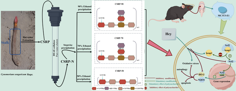 為了解決鎖陽資源利用中存在的上述科學(xué)問題,中國科學(xué)院西北高原生物研究所青海省藏藥藥理學(xué)和安全性評價研究重點(diǎn)實驗室團(tuán)隊,采用熱水提取、乙醇沉淀分級及柱層析純化相結(jié)合的方法,從鎖陽中得到3個多糖組分:CSRP-50、CSRP-70和CSRP-90,隨后對其組成、結(jié)構(gòu)、Hcy誘導(dǎo)成骨細(xì)胞氧化損傷保護(hù)作用進(jìn)行研究。組成結(jié)構(gòu)研究結(jié)果表明,3個多糖組分均為天然甲基化的α-(1→4),(1→6)-D-葡聚糖,其主鏈由α-1,4-D-Glcp和α-1,6-D-Glcp交替構(gòu)成。其中,CSRP-50無支鏈結(jié)構(gòu),CSRP-70和CSRP-90存在由α-1,6-D-Glcp和末端1位連接的α(β)-D-Glcp構(gòu)成的支鏈,該支鏈結(jié)構(gòu)連接在主鏈α-1,4-D-Glcp的O-6位。藥理活性研究結(jié)果表明,CSRP-50、CSRP-70和CSRP-90均可通過激活Keap1/Nrf2信號通路,增強(qiáng)成骨細(xì)胞抗氧化能力,進(jìn)而保護(hù)成骨細(xì)胞對抗Hcy誘導(dǎo)的氧化應(yīng)激損傷,表現(xiàn)出很好的抗骨質(zhì)疏松作用潛力。該研究為鎖陽及其多糖成分在抗骨質(zhì)疏松癥方面的進(jìn)一步研究與利用提供科學(xué)依據(jù)。