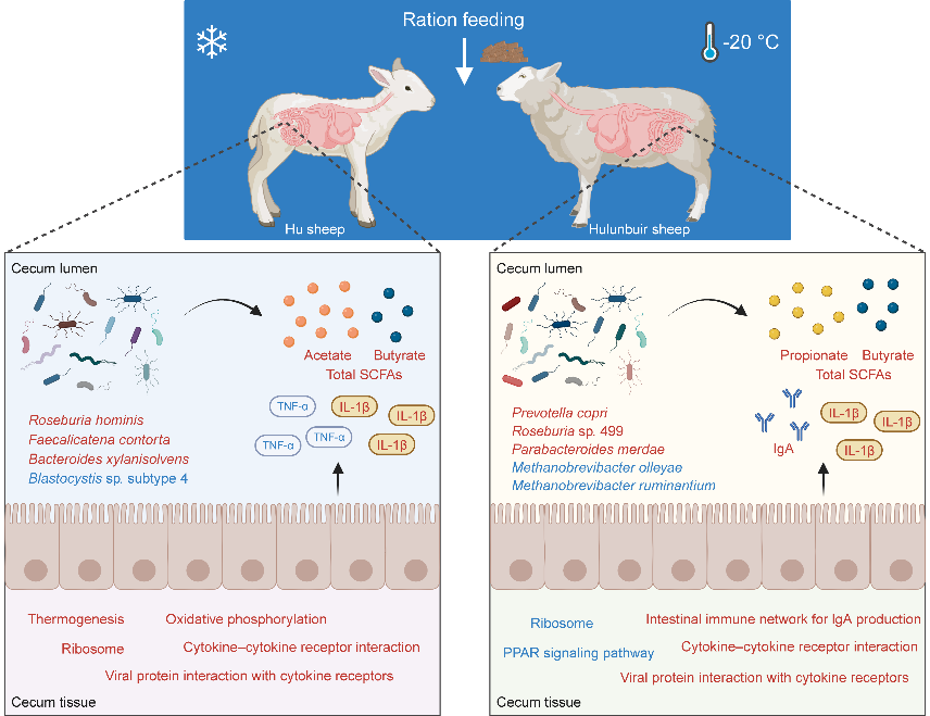 近期,中國科學(xué)院西北生態(tài)環(huán)境資源研究院畜牧團隊聯(lián)合山東省農(nóng)業(yè)科學(xué)院、黃三角生物遺傳與分子精準(zhǔn)育種實驗室和黃河口生物精準(zhǔn)營養(yǎng)研發(fā)中心,以呼倫貝爾羊(耐寒型)與湖羊(低溫敏感型)為研究對象,通過構(gòu)建綿羊冷慢性應(yīng)激模型,結(jié)合限飼控制,系統(tǒng)解析了盲腸微生物群落、代謝產(chǎn)物及宿主轉(zhuǎn)錄組的協(xié)同響應(yīng)機制。
