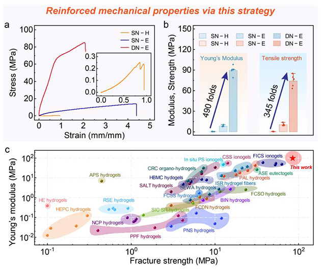 超強(qiáng)凝膠通常模量和強(qiáng)度較高,但力學(xué)韌性一直是挑戰(zhàn)。該研究通過將低共熔溶劑(DES)引入半結(jié)晶性PVA水凝膠中進(jìn)行機(jī)械訓(xùn)練,實(shí)現(xiàn)了超高強(qiáng)度與優(yōu)異韌性的兼容(圖1)。在溶劑置換過程中,通過氫鍵重構(gòu)促進(jìn)PVA結(jié)晶增強(qiáng),形成密集的納米晶域并賦予超滯后效應(yīng),實(shí)現(xiàn)單次預(yù)伸展的“超滯后介導(dǎo)的機(jī)械訓(xùn)練”。同時,得益于超滯后的結(jié)構(gòu)阻滯效應(yīng),機(jī)械訓(xùn)練后的單網(wǎng)絡(luò)凝膠還可進(jìn)一步浸泡前驅(qū)液,并通過自由基聚合構(gòu)建化學(xué)交聯(lián)的第二網(wǎng)絡(luò)形成層級互穿。此層級互穿的雙網(wǎng)絡(luò)結(jié)構(gòu)賦予凝膠材料微觀協(xié)同介觀的多尺度能量耗散特性,極大地提升了力學(xué)性能,其斷裂強(qiáng)度達(dá)~ 85.2 MPa、楊氏模量為~ 98 MPa、斷裂韌性提升至~ 130.6 MJ·m?3,遠(yuǎn)優(yōu)于目前報(bào)道的強(qiáng)韌聚合物凝膠體系(圖2)。