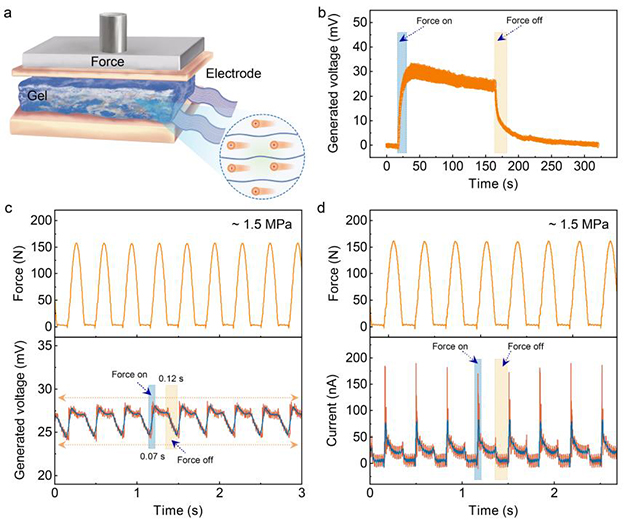 界面之間的運(yùn)動、行為會耗散大量的機(jī)械能,比如界面摩擦,潤滑是減小能源消耗的有效途徑。然而,對于一些極端工況,界面的機(jī)械耗散是不可避免的,為此,針對極端環(huán)境下的高承載或高抗沖擊工程軟材料需求,超滯后介導(dǎo)的機(jī)械訓(xùn)練構(gòu)建的超強(qiáng)共晶凝膠可通過力電轉(zhuǎn)導(dǎo)的方式收集機(jī)械能,并將轉(zhuǎn)化的電能作為傳感信號反映壓力應(yīng)變(圖3),該研究展示了共晶凝膠在高溫環(huán)境中的力學(xué)穩(wěn)定性及作為離子壓電機(jī)械感受器在壓力驅(qū)動力電轉(zhuǎn)導(dǎo)的響應(yīng)性能,實(shí)現(xiàn)了強(qiáng)韌力學(xué)與電學(xué)性能之間的力?電耦合的協(xié)同設(shè)計(jì),為性能和功能的適配耦合提供了全新的設(shè)計(jì)范式和構(gòu)建策略。