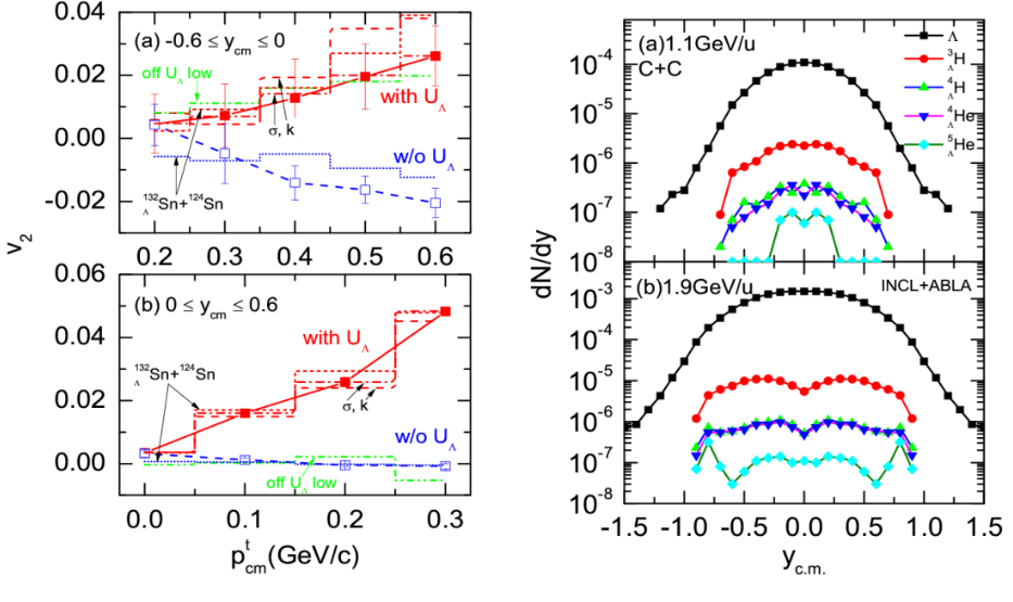 左圖:超核-原子核碰撞中的超子橢圓流隨橫動量的變化情況。上窗口對應(yīng)負快度,下窗口對應(yīng)正快度。圖中展示了不同重子散射截面、不同物態(tài)方程、超子勢的不同密度區(qū)間,以及不同的反應(yīng)系統(tǒng)對超子橢圓流的影響。右圖:碳碳碰撞中的輕超核產(chǎn)生的快度分布。上窗口對應(yīng)1.1 GeV每核子束流能的情況,下窗口對應(yīng)的是1.9 GeV情況。