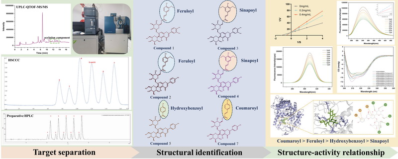 中國(guó)科學(xué)院西北高原生物研究所高原藏藥資源質(zhì)控與藥理毒理評(píng)價(jià)研究團(tuán)隊(duì)通過建立UPLC-QTOF-MS/MS結(jié)合高速逆流色譜和制備液相色譜的靶向分離技術(shù),成功從青稞苗中分離得到6個(gè)以大麥黃苷和皂草黃苷為母核的不同酰基修飾的衍生物。通過多維度的分子相互作用研究發(fā)現(xiàn),大麥黃苷和皂草黃苷?;螅洇?葡萄糖苷酶抑制活性均明顯提高,表現(xiàn)為香豆酰基>阿魏?;?gt;對(duì)羥基苯甲酰基>芥子?;?。6個(gè)酰化黃酮與α-葡萄糖苷酶均具有較高的結(jié)合常數(shù),主要通過范德華力和氫鍵作用占據(jù)α-葡萄糖苷酶的活性位點(diǎn)并形成穩(wěn)定的復(fù)合物,并改變關(guān)鍵氨基酸殘基和二級(jí)結(jié)構(gòu),從而降低酶催化活性。該研究為復(fù)雜天然產(chǎn)物的靶向分離純化以及?;S酮與α-葡萄糖苷酶抑制活性之間的構(gòu)效關(guān)系的研究提供了新的思路。