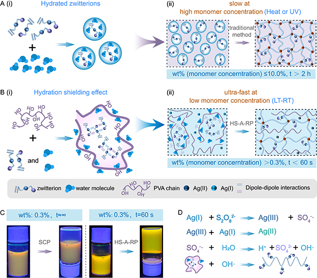 近日,中國科學院蘭州化學物理研究所潤滑材料全國重點實驗室材料表面與界面研究組周峰研究員團隊提出了基于一種基于“水合屏蔽”效應(yīng)的聚兩性離子水凝膠制備新方法——HS-A-RP,創(chuàng)新地將PVA作為水合屏蔽劑引入Ag+-S2O82-氧化還原催化體系中,實現(xiàn)了通用性兩性離子單體在寬單體濃度范圍(質(zhì)量分數(shù):0.3-50 wt%)、寬溫域(-5℃-37℃)內(nèi)的超快速聚合(t<60 秒),且反應(yīng)而無需外部能量(紫外光/熱)的輸入。