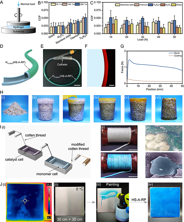 與傳統(tǒng)光/熱引發(fā)體系相比,HS-A-RP 制備的聚兩性離子水凝膠不僅具有更致密的網(wǎng)絡(luò)結(jié)構(gòu)和更好的機械性能,還展現(xiàn)出了優(yōu)異的抗溶脹、潤滑、抗菌和防污性能。通過HS-A-RP方法制備的聚兩性離子水凝膠既能夠作為功能涂層有效改善生物醫(yī)用器械的表面潤滑性,又能實現(xiàn)對熱敏材料和砂礫的原位封裝。此外,快速凝膠化和寬溫域內(nèi)可反應(yīng)的特性使HS-A-RP能夠在不同基底表面和極端穩(wěn)定環(huán)境條件下規(guī)?;苽渚蹆尚噪x子水凝膠涂層。該方法不僅為聚兩性離子水凝膠的化學合成提供了新途徑,還極大地拓展了其在生物醫(yī)療、工程裝備等領(lǐng)域應(yīng)用領(lǐng)域。