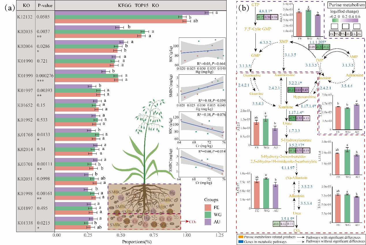 針對這一問題,中國科學(xué)院西北高原生物研究所三江源草原生態(tài)系統(tǒng)國家觀測研究站團隊在青藏高原祁連山南麓選擇了圍封(FE)、冬季放牧(WG)和開墾(AU)3種不同干擾的草地管理措施為研究對象,探明了微生物群落結(jié)構(gòu)和功能如何響應(yīng)因草地管理引起的植被群落和PTEs的變化,以及對它們的調(diào)控路徑。研究結(jié)果表明,草地管理措施改變了地上禾本科和豆科植被群落的結(jié)構(gòu)及地下生物量的分配,導(dǎo)致K的分布變化,進而引起真菌群落結(jié)構(gòu)和氮代謝酶的顯著變化。Cr和Hg與微生物相互作用影響SOC和SMBC的代謝過程,可能對高寒草甸固碳具有一定積極作用,并且高寒草甸對PTEs具有良好的抗性。適度干擾的冬季放牧(WG)有利于維持高寒草地微生物群落結(jié)構(gòu)和功能的穩(wěn)定性。本研究為青藏高原祁連山高寒草甸的改善提供科學(xué)依據(jù)。