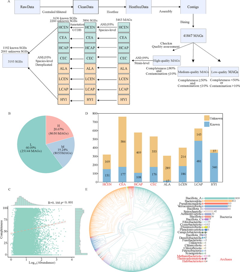 研究采集了青藏高原地區(qū)多種鹿科動物的糞便樣本,并結(jié)合公共數(shù)據(jù)庫中平原地區(qū)鹿科動物樣本進(jìn)行分析,通過宏基因組組裝共獲得了41,847個宏基因組組裝基因組(MAGs),并構(gòu)建了3,193個高質(zhì)量物種水平基因組,建立了目前最為系統(tǒng)、全面的鹿科動物腸道微生物組數(shù)據(jù)庫。這是國內(nèi)外首個基于多物種、大規(guī)模宏基因組分析的鹿科動物腸道微生物資源庫,為后續(xù)功能挖掘、微生物資源利用及瀕危物種保護(hù)提供了堅實(shí)的數(shù)據(jù)基礎(chǔ)。