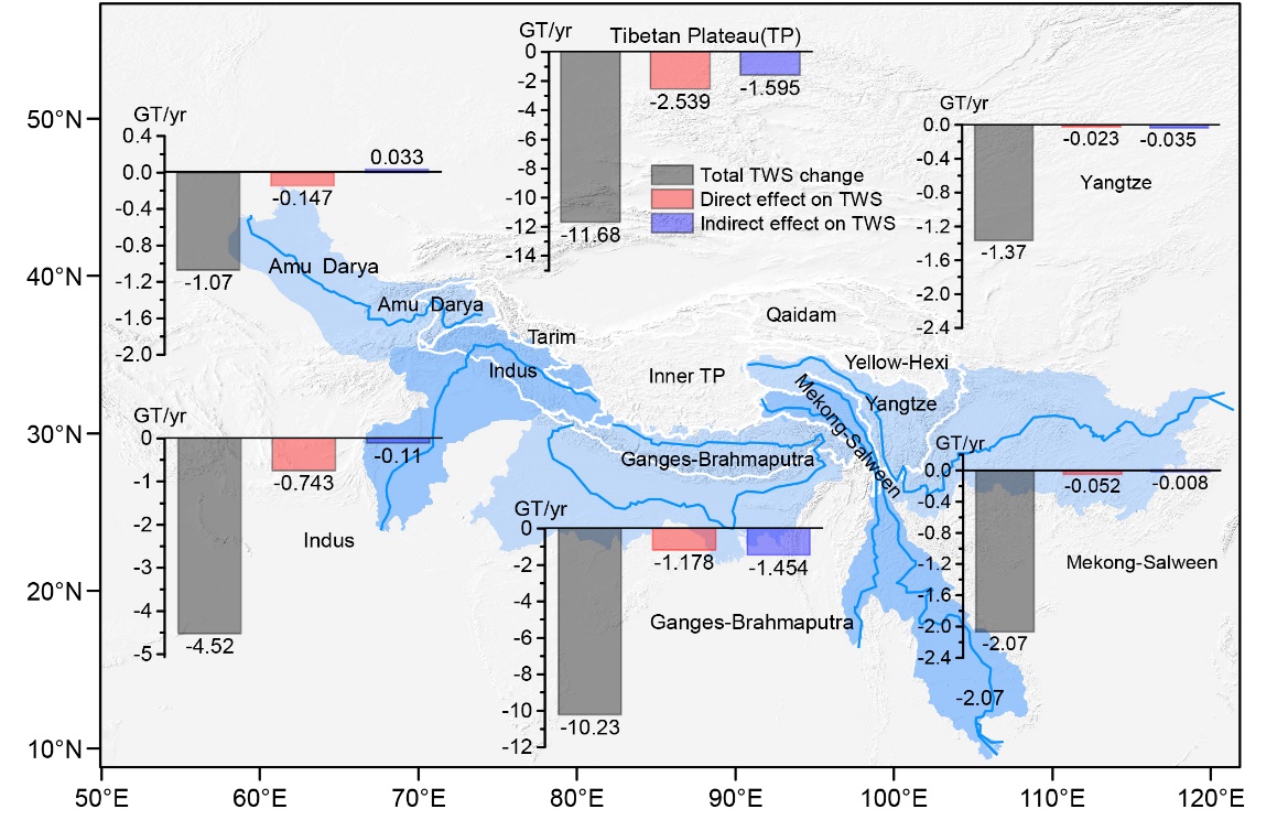 結(jié)果表明,2007至2016年間,南亞黑碳沉降使青藏高原冰川反照率降低,導(dǎo)致消融量增加7.5%;同時(shí)南亞黑碳導(dǎo)致的高原降水減少帶來(lái)冰川物質(zhì)負(fù)平衡(虧損)增多6.1%;其中,喜馬拉雅地區(qū)尤為顯著,冰川物質(zhì)負(fù)平衡增幅達(dá)到33.7%。冰川物質(zhì)虧損導(dǎo)致陸表水儲(chǔ)量減少,其中青藏高原南部流域陸表水儲(chǔ)量減少顯著,尤其在印度河與恒河-布拉馬普特拉河等內(nèi)流盆地。