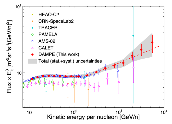 近期,暗物質(zhì)粒子探測衛(wèi)星(DAMPE)“悟空”號國際合作組在高能宇宙線能譜測量方面取得重要進(jìn)展,獲得了宇宙射線硼元素在10 GeV/n–8 TeV/n的微分通量譜,首次發(fā)現(xiàn)了182 GeV/n附近能譜“硬化”的現(xiàn)象。研究成果發(fā)表于《物理評論快報》(Physical Review Letters)。