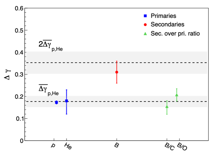 圖3:“悟空”號觀測到的硼元素譜指數(shù)變硬程度(?γ)約為初級宇宙線質(zhì)子和氦核的兩倍