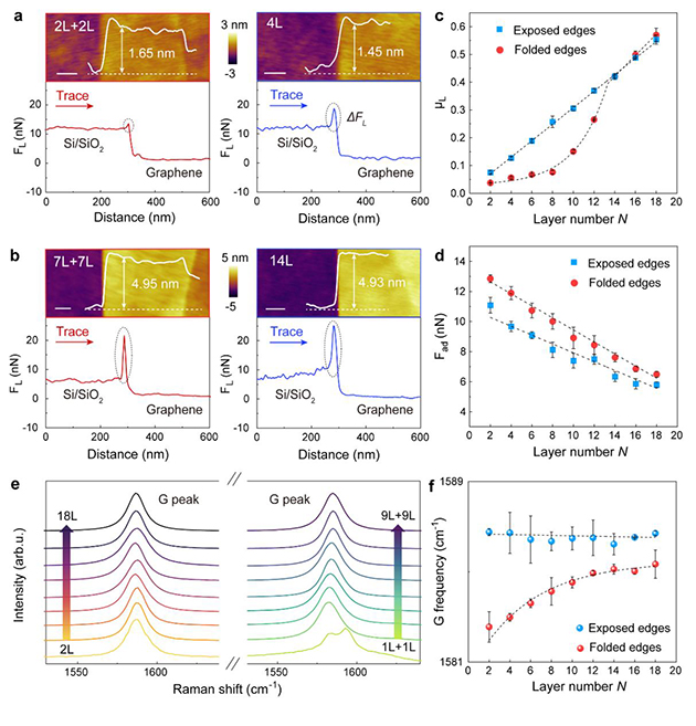 團(tuán)隊(duì)基于原子力顯微鏡納米針尖操縱技術(shù),構(gòu)筑了具有可控曲率與層數(shù)的折疊石墨烯邊緣拓?fù)浣Y(jié)構(gòu)(圖1),系統(tǒng)開展了納米尺度摩擦測(cè)量。研究發(fā)現(xiàn),折疊石墨烯邊緣摩擦力隨層數(shù)呈現(xiàn)出顯著的非線性變化(圖2),違背了經(jīng)典摩擦定律在固-固界面下的適用性。