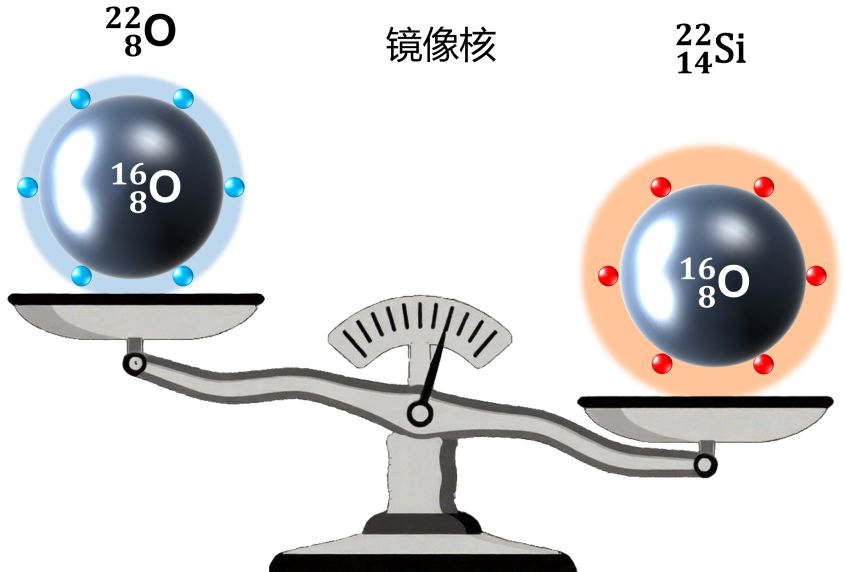 圖:硅-22及其鏡像核氧-22結構示意圖。通過硅-22的質(zhì)量測量,結合理論計算,科研人員揭示了硅-22具有與氧-22相似的雙幻結構,但同時存在輕微的對稱破缺,具有更外延的質(zhì)子空間分布。(圖源/近代物理所)