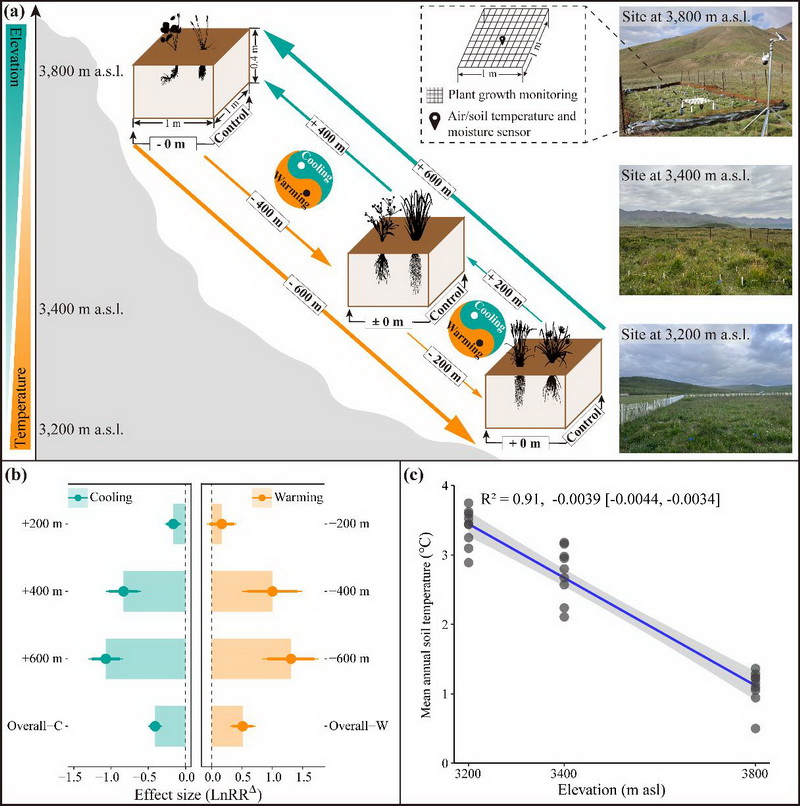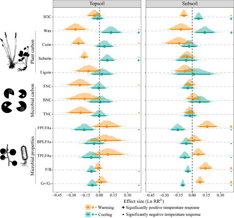 中國(guó)科學(xué)院西北高原生物研究所高寒生態(tài)系統(tǒng)與全球變化研究團(tuán)隊(duì)依托2007年在青海海北高寒草地生態(tài)系統(tǒng)國(guó)家野外科學(xué)觀測(cè)研究站建立的“山體垂直帶雙向移栽實(shí)驗(yàn)”平臺(tái),基于生物標(biāo)志物技術(shù),并借助貝葉斯Meta統(tǒng)計(jì)分析在估計(jì)研究間異質(zhì)性和合并效應(yīng)量方面的優(yōu)勢(shì)(尤其在納入研究數(shù)量較少時(shí))、獨(dú)特的后驗(yàn)分布估計(jì)、靈活的參數(shù)設(shè)置和便利的結(jié)果圖形化展示方法等特點(diǎn),創(chuàng)新性地采用貝葉斯Meta分析方法分析控制實(shí)驗(yàn)數(shù)據(jù),對(duì)多組處理、對(duì)照實(shí)驗(yàn)進(jìn)行了歸納性總結(jié),進(jìn)而系統(tǒng)評(píng)估量化了增溫、降溫16年后高寒草甸表層(0-10 cm)和亞表層土壤(20-30 cm)有機(jī)碳含量的影響因素(包括植物生物量和多樣性、土壤理化性質(zhì)、植物源碳組分,微生物源碳組分以及微生物群落特性等)的變化及其與有機(jī)碳含量的關(guān)系。