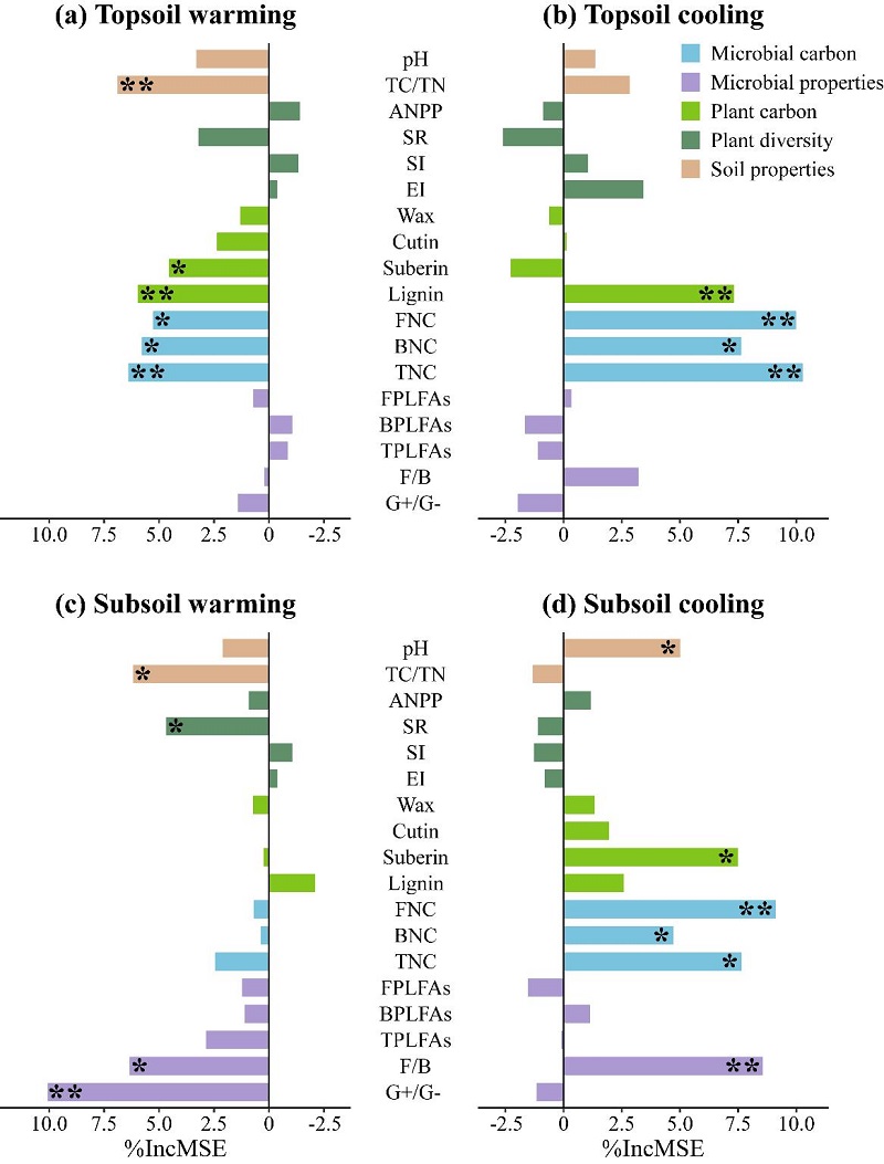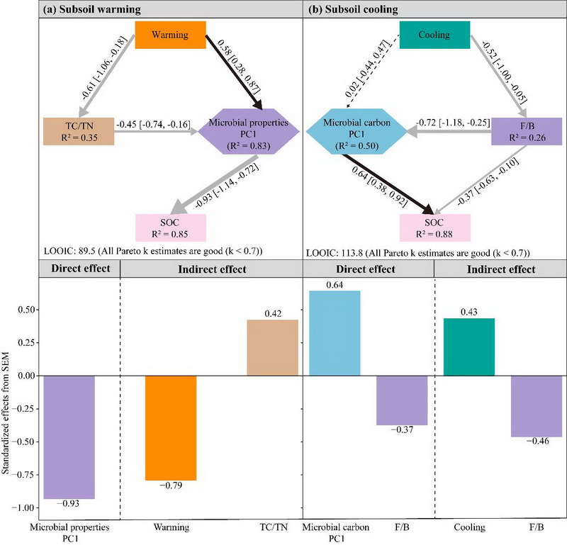 研究發(fā)現(xiàn),高寒草甸亞表層土壤有機(jī)碳對(duì)增溫、降溫的響應(yīng)較表層更為敏感,無論是增溫還是降溫,均未引起亞表層土壤中植物和微生物源碳組分的顯著變化。然而,增溫使真菌與細(xì)菌生物量比值(F/B)和革蘭氏陽性細(xì)菌與革蘭氏陰性細(xì)菌生物量比值(G+/G-)分別增加15.0%和8.6%,而降溫則使其分別降低4.5%和9.6%。進(jìn)一步分析發(fā)現(xiàn),增溫主要通過增加F/B和G+/G-直接減少土壤有機(jī)碳庫的積累,同時(shí)降低土壤碳氮比間接減少亞表層土壤有機(jī)碳含量,而降溫則主要通過降低F/B增加亞表層土壤有機(jī)碳含量。如果只考慮增溫而不考慮降溫的作用,傳統(tǒng)的增溫控制實(shí)驗(yàn)可能會(huì)低估氣候變暖對(duì)高寒草地亞表層土壤有機(jī)碳庫的消極作用。該研究為更好地解釋和預(yù)測(cè)未來氣候變化背景下高寒草地生態(tài)系統(tǒng)土壤碳庫的形成與變化提供了新的理論依據(jù)。