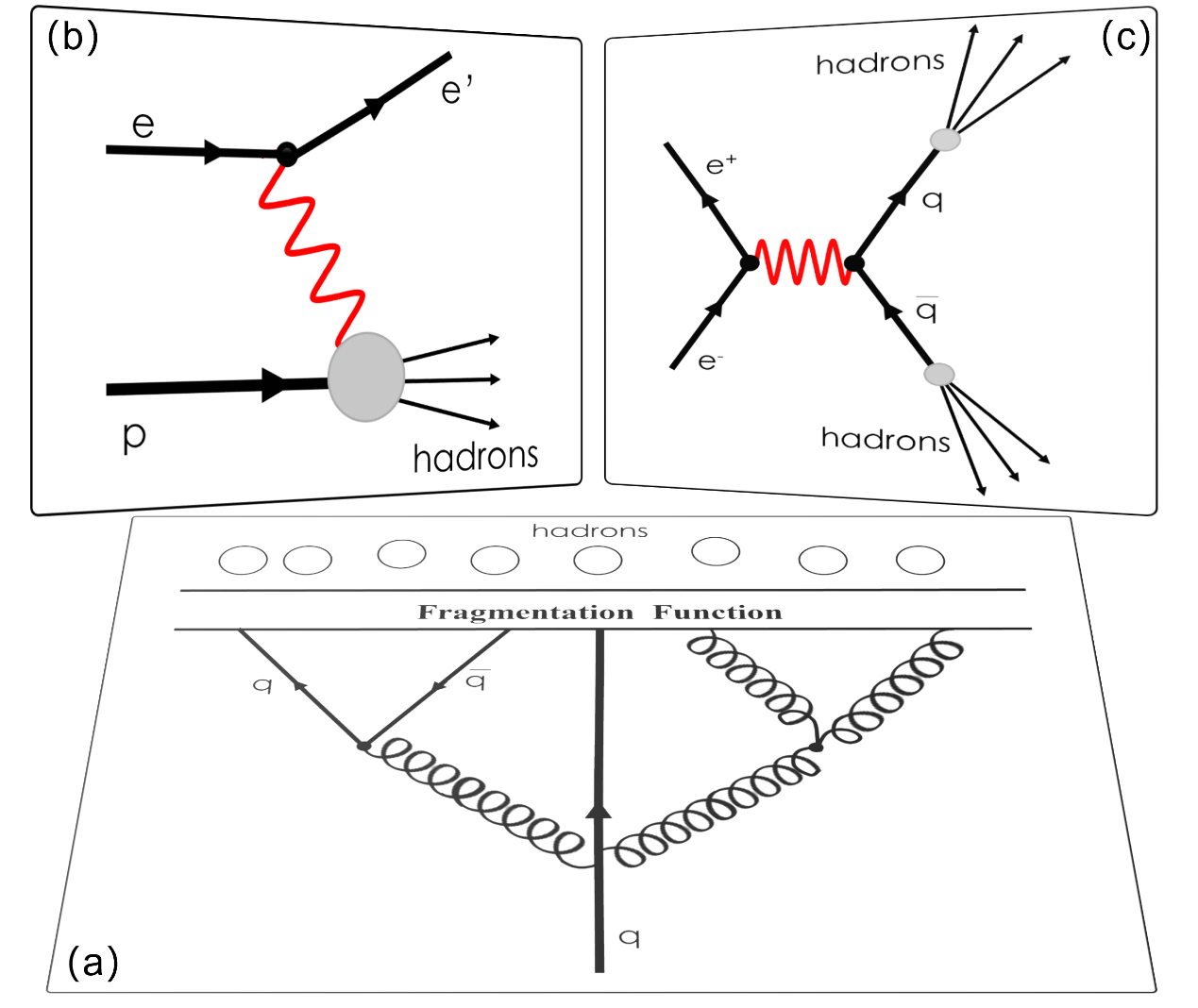 圖:(a)部分子碎裂至強子過程示意圖,(b)電子-質(zhì)子半單舉深度非彈性散射過程示意圖 (c)正負電子湮滅過程示意圖。