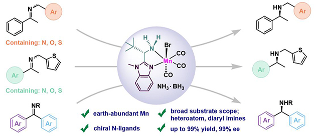 近日,中國科學(xué)院蘭州化學(xué)物理研究所低碳催化與二氧化碳利用全國重點(diǎn)實(shí)驗(yàn)室仿生催化與低碳化學(xué)組,在前期發(fā)展的錳催化不對(duì)稱轉(zhuǎn)移氫化反應(yīng)的基礎(chǔ)上 (ACS Catal.,2021,11,8033-8041;J. Catal.,2022,413,487-497;J. Catal.,2024,438,115680),在含雜原子(N,O,S)亞胺和雙芳基亞胺的不對(duì)稱轉(zhuǎn)移氫化反應(yīng)取得了新進(jìn)展。