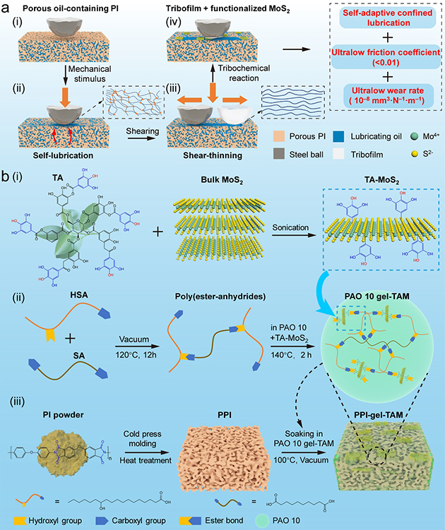 近期,中國科學(xué)院蘭州化學(xué)物理研究所潤滑材料全國重點(diǎn)實(shí)驗室王道愛研究員團(tuán)隊基于"自適應(yīng)限域潤滑"的策略(圖1),設(shè)計制備了MoS2-油凝膠復(fù)合的多孔聚酰亞胺(PPI-gel-TAM),具有高的儲油能力(18.2%)和油保持率(97.7%),實(shí)現(xiàn)了鋼/PPI界面自適應(yīng)的宏觀超潤滑(摩擦系數(shù):~0.007)和超低的磨損率(2.81×10-8·mm3·N-1·m-1),展現(xiàn)出出色的摩擦學(xué)性能,為未來發(fā)展高性能的工程極限潤滑材料提供了新的見解和思路。