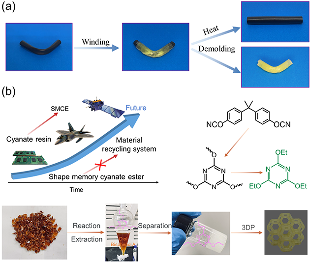 為探索SMCE的應(yīng)用潛力,研究人員依托酯鍵與三嗪環(huán)的動態(tài)協(xié)同交換特性,構(gòu)建了SMCE智能模具(ACS Appl. Mater. Interfaces. 15(20) (2023) 24968-24977)。該模具不僅可實(shí)現(xiàn)光固化和室溫固化材料的精準(zhǔn)成型,更能在自身轉(zhuǎn)變溫度以上適配高溫固化材料的成型需求,有效降低了溫度對模具服役穩(wěn)定性的制約。針對SMCE及模具損壞后可能造成的環(huán)境污染與資源浪費(fèi)問題,通過三嗪環(huán)的親核芳香取代反應(yīng)實(shí)現(xiàn)了熱固性SMCE的閉環(huán)回收(ACS Appl. Polym. Mater. 6(24) (2024) 15313-15322)?;厥盏闹鳟a(chǎn)物三乙基三嗪可被應(yīng)用于3/4D打印,以及形狀記憶氰酸酯彈性體的合成,為構(gòu)建SMCE材料循環(huán)體系提供了關(guān)鍵的技術(shù)支撐。