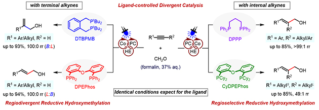 研究人員采用甲醛水溶液作為低成本的C1源,在藍光激發(fā)下,以4CzPN作為光催化劑、CoBr2為金屬催化劑,并借助Hantzsch酯與水作為復(fù)合氫源,在室溫條件下實現(xiàn)了烯丙醇類化合物的高效合成。該體系的突出優(yōu)勢在于可通過配體調(diào)控靈活實現(xiàn)產(chǎn)物結(jié)構(gòu)的多樣化,當(dāng)使用DTBPMB作為配體時,反應(yīng)高選擇性地生成支鏈型烯丙醇;而換用DPEPhos配體,則可高效獲得線性烯丙醇產(chǎn)物。此外,若采用DPPP或CyDPEPhos為配體,該催化體系還能以優(yōu)良的選擇性實現(xiàn)芳基/烷基內(nèi)炔與甲醛的羥甲基化反應(yīng),展現(xiàn)出良好的官能團適應(yīng)性和合成應(yīng)用潛力。機理研究表明,該反應(yīng)經(jīng)歷了低價鈷物種與甲醛和炔烴發(fā)生氧化環(huán)化,生成氧雜五元環(huán)鈷中間體然后質(zhì)子化的過程。