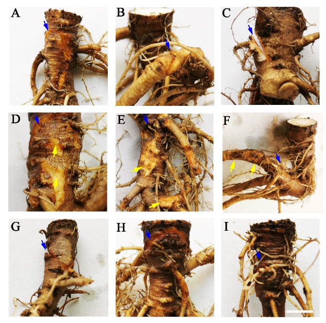 綜合證據(jù)表明,雙核立枯絲核菌 AG-K(Ceratobasidium sp. AG-K)為當(dāng)歸麻口病的主要致病真菌。與傳統(tǒng)“根腐病”病因不同,雙核立枯絲核菌能夠誘發(fā)麻口病典型的地上部葉片黃化/壞死斑與地下主根表皮縱裂等癥狀,進(jìn)而造成商品性和質(zhì)量指標(biāo)的下降。