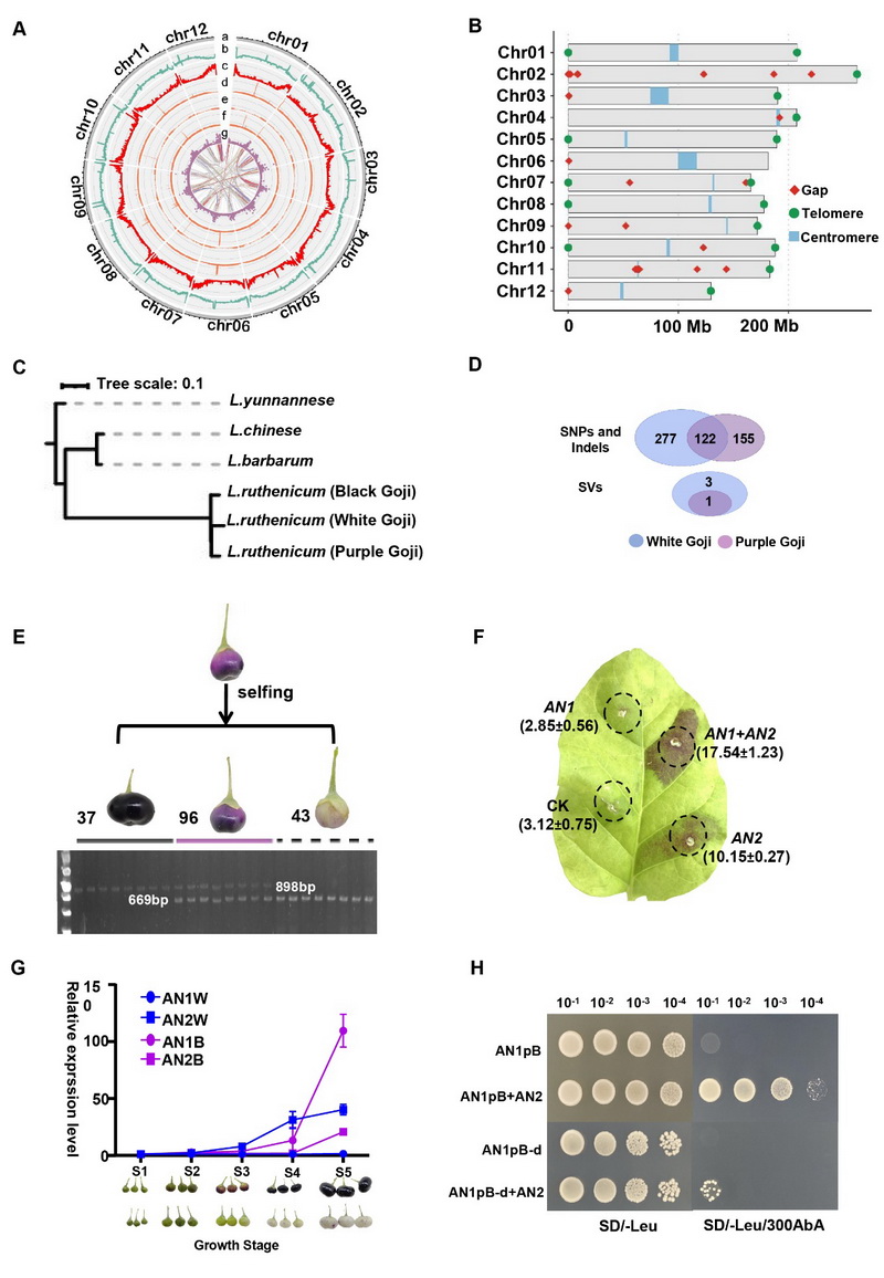 圖?黑果枸杞高質(zhì)量基因組及229 bp AN1 啟動子缺失導(dǎo)致果色分化。(A) 染色體基因組特征分布。(B) 缺口、端粒和著絲粒位置。(C) 枸杞屬系統(tǒng)發(fā)育樹。(D) 白、紫與黑果枸杞間花青素相關(guān)變異。(E) 紫果后代果色分離及基因型鑒定。(F) AN1/AN2 在煙草瞬時表達(dá)。(G) 白果與黑果 AN1/AN2 表達(dá)動態(tài)。(H) Y1H 驗(yàn)證 AN2 與 AN1 啟動子的結(jié)合。