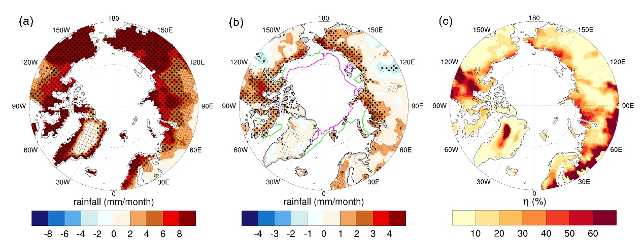 全強(qiáng)迫(a)和僅海冰消融強(qiáng)迫(b)下的北極陸地夏季降雨量的多模式平均響應(yīng),(c)海冰消融對降雨變化的貢獻(xiàn)率