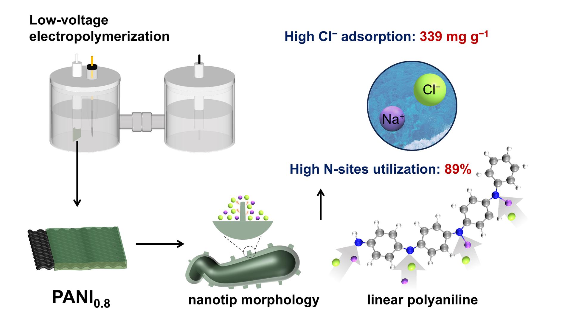 在鹵水資源電化學(xué)提取過程中,需兼顧電中性原則,因此高效提取伴生陰離子同樣重要。聚苯胺(PANI)憑借優(yōu)異的導(dǎo)電性和可逆摻雜特性,廣泛應(yīng)用于能源存儲(chǔ)、環(huán)境凈化和離子分離等領(lǐng)域。然而,傳統(tǒng)PANI因氮活性位點(diǎn)利用率低、微宏觀構(gòu)效關(guān)系不明確等問題,限制了其在高性能電化學(xué)脫鹽中的應(yīng)用。研究團(tuán)隊(duì)創(chuàng)造性發(fā)現(xiàn)聚合電位是調(diào)控其微觀結(jié)構(gòu)(如聚合度、鏈結(jié)構(gòu)、缺陷類型)的關(guān)鍵參數(shù)。通過原位電化學(xué)光譜等手段論證,采用“低電位”策略可有效抑制偶聯(lián)副反應(yīng),制備出含納米尖端的低聚度線性結(jié)構(gòu)聚苯胺。該獨(dú)特結(jié)構(gòu)顯著提升了含氮位點(diǎn)的暴露效率和可接近性:實(shí)現(xiàn)突破性高容量氯離子吸附(Cl容量達(dá)339 mg/g)和鈉離子吸附(142 mg/g)。該工作顯著推動(dòng)了結(jié)構(gòu)可控聚合物的設(shè)計(jì)及其在電化學(xué)分離中的應(yīng)用。