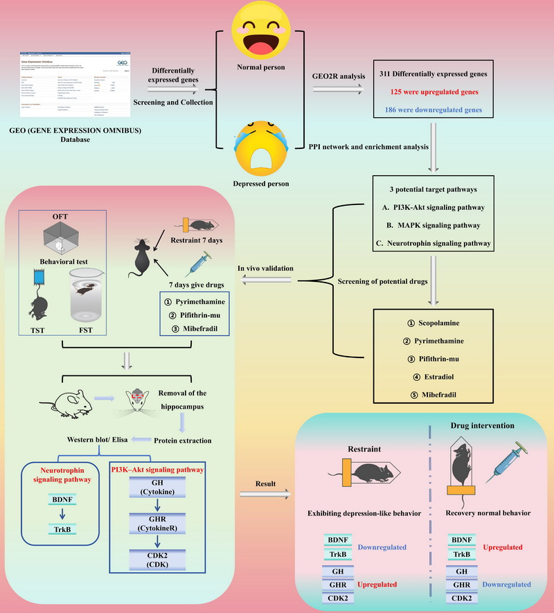 中國科學(xué)院西北高原生物研究所高原藏藥資源質(zhì)控與藥理毒理評價(jià)研究團(tuán)隊(duì)以抑郁癥患者基因表達(dá)數(shù)據(jù)為基礎(chǔ),先從GEO數(shù)據(jù)庫篩選出311個(gè)差異表達(dá)基因,經(jīng)加權(quán)基因共表達(dá)網(wǎng)絡(luò)分析、蛋白 - 蛋白相互作用網(wǎng)絡(luò)構(gòu)建及通路富集分析,發(fā)現(xiàn)這些基因主要富集于 PI3K-Akt、MAPK 和神經(jīng)營養(yǎng)因子三大與抑郁癥發(fā)病相關(guān)的信號通路;隨后利用第二代 CMAP 平臺,結(jié)合文獻(xiàn)調(diào)研篩選出3種候選小分子化合物(pyrimethamine,pifithrin-mu,mibefradil),通過分子對接實(shí)驗(yàn)驗(yàn)證,它們與上述通路關(guān)鍵蛋白(如 CDK2、TrkB 等)親和力高,部分滿足 “強(qiáng)結(jié)合” 標(biāo)準(zhǔn)(≤-7 kcal/mol);接著在慢性束縛應(yīng)激小鼠模型中驗(yàn)證 pyrimethamine,pifithrin-mu,mibefradil的抗抑郁效果,行為學(xué)測試(曠場試驗(yàn)、強(qiáng)迫游泳試驗(yàn)、懸尾試驗(yàn))顯示三者能顯著改善小鼠抑郁樣行為,效果與氟西汀相當(dāng);機(jī)制研究通過 Western blot 與 ELISA 實(shí)驗(yàn)證實(shí),三者可調(diào)控 PI3K-Akt 和神經(jīng)營養(yǎng)因子通路關(guān)鍵蛋白表達(dá)(降低 GH、GHR、CDK2 異常高表達(dá),上調(diào) BDNF、TrkB 表達(dá)),Pearson 相關(guān)性分析驗(yàn)證了通路調(diào)控與抗抑郁效果的直接關(guān)聯(lián),同時(shí)該研究還證實(shí) “老藥新用” 策略在抗抑郁藥物研發(fā)中的高效性,并建立 “多數(shù)據(jù)庫整合 - 多組學(xué)分析 - 體內(nèi)外驗(yàn)證” 的框架,成功挖掘出 3 種具有抗抑郁潛力的小分子化合物,為抑郁癥治療提供新候選藥物及作用機(jī)制參考。