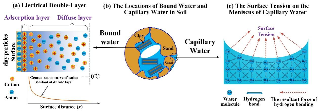 研究通過(guò)將電解質(zhì)溶液相變機(jī)制與雙電層理論相結(jié)合,構(gòu)建了凍土未凍水理論模型,定量刻畫(huà)了土壤鹽分(溶液濃度、溶質(zhì)種類(lèi)及比例)、表面電荷密度、溫度以及土壤類(lèi)型(比表面積)等因素對(duì)未凍水含量的影響,克服了傳統(tǒng)土水勢(shì)模型難以實(shí)現(xiàn)物理參數(shù)化的固有局限。