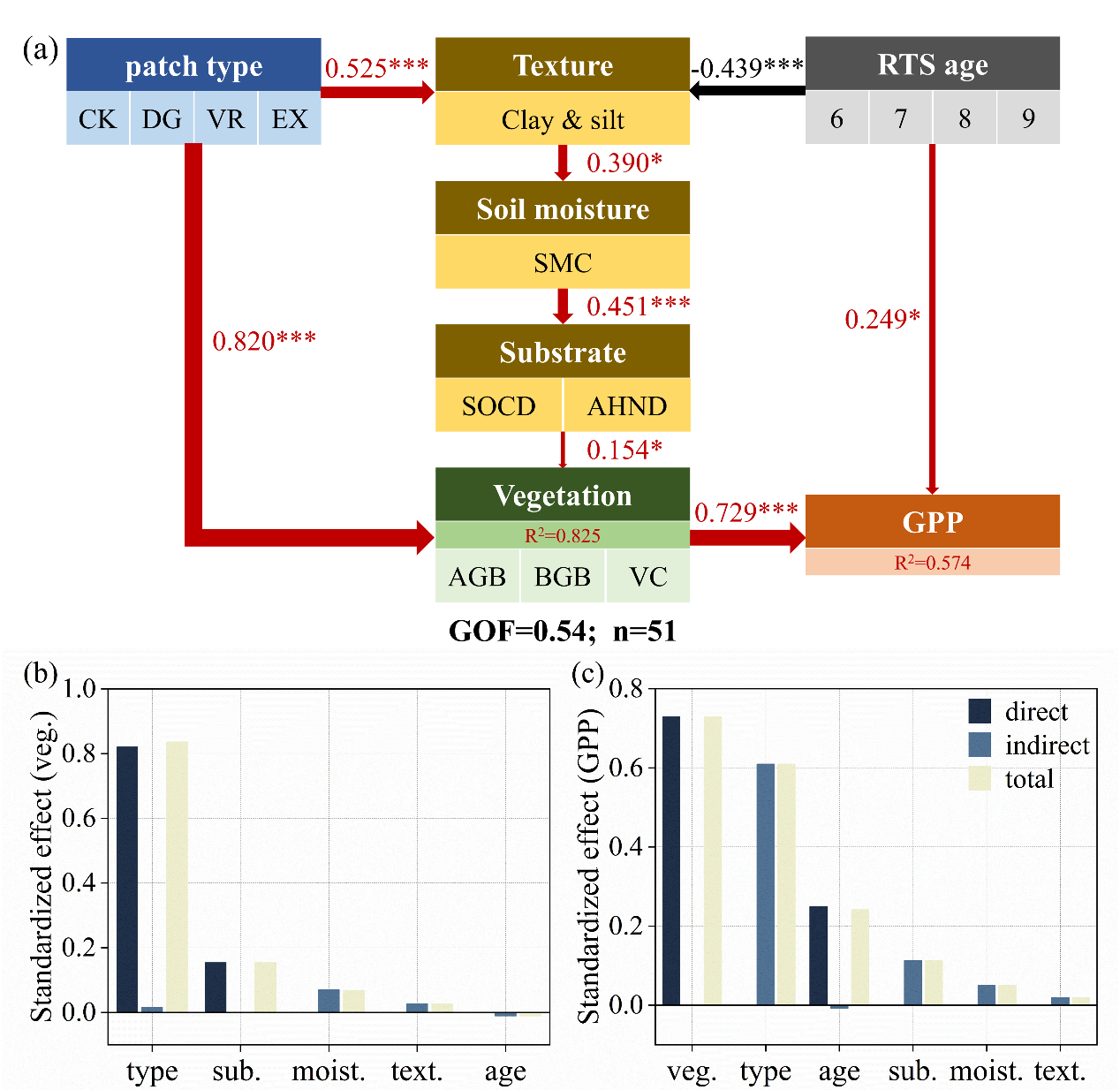 偏最小二乘路徑模型結(jié)果表明,熱融滑塌主要通過“土壤質(zhì)地-水分-基質(zhì)-植被-GPP”路徑影響青藏高原生態(tài)系統(tǒng)功能。其中植被對(duì)GPP的直接控制最強(qiáng),滑塌年齡次之,土壤過程則更多通過調(diào)節(jié)群落結(jié)構(gòu)間接作用影響GPP。因此,在評(píng)估熱喀斯特地貌的碳效應(yīng)時(shí),應(yīng)將滑塌地表類型及年齡組成納入考量。