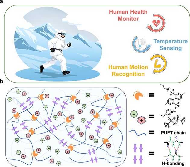 為探索聚氨酯材料的應(yīng)用潛力,基于上述研究,研究人員對聚氨酯材料內(nèi)部分子網(wǎng)絡(luò)設(shè)計和功能化進行深入研究。為實現(xiàn)材料的導(dǎo)電性,引入更多具有額外極性的極性鍵是一種可能的策略,如碳-氟(C-F)鍵。由于F原子的高電負(fù)性,C-F鍵的強靜電性質(zhì)會增強進入體系的電子極性,這樣陰離子和陽離子可彼此分布得更遠,在聚合物內(nèi)部移動更自由?;诖?,研究人員提出了一種分子工程范式,利用氟的雙重功能在聚氨酯基質(zhì)中構(gòu)建空間相關(guān)但功能獨立的動態(tài)網(wǎng)絡(luò)。通過引入含氟擴鏈劑和多氫鍵單元,構(gòu)建了氟-陽離子相互作用與高密度氫鍵協(xié)同的動態(tài)網(wǎng)絡(luò),氟的高電負(fù)性不僅與封端劑形成離子鍵增強網(wǎng)絡(luò)穩(wěn)定性,還通過偶極相互作用固定陽離子,構(gòu)建陰離子傳輸通道,保障離子高效遷移。從而成功制備了一種具備超敏感多參數(shù)監(jiān)測功能,可用于極地可穿戴設(shè)備形狀記憶聚氨酯材料。