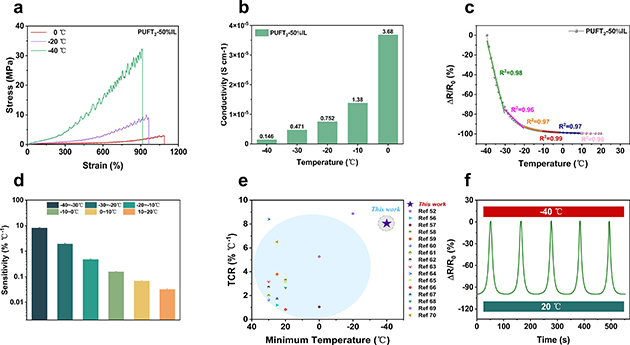 針對極地等極端環(huán)境的挑戰(zhàn),團隊重點測試了材料的低溫耐受性。在-40℃時,材料仍能保持較高的強度、韌性、可拉伸性和離子電導(dǎo)率。此外,該材料表現(xiàn)出負(fù)溫度系數(shù)行為,在-40℃至-30℃超低溫區(qū)間的溫度系數(shù)電阻高達8.05% ℃-1,且在連續(xù)熱循環(huán)測試中表現(xiàn)出良好的穩(wěn)定性和可重復(fù)性,彰顯了其在深冷環(huán)境下可靠應(yīng)用的潛力。