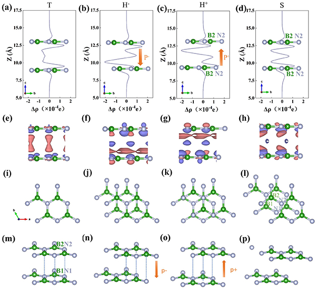 圖1.雙層h-BN的四種構(gòu)型對應(yīng)的一維(a-d)和三維(e-h)差分電荷密度以及構(gòu)型的頂視(i-l)和側(cè)視圖(m-p)。