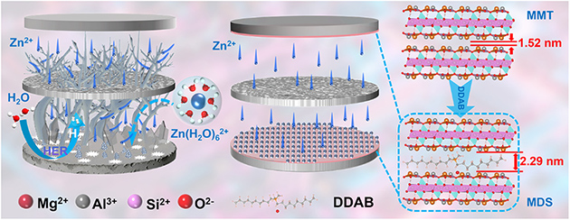 在上述研究工作基礎(chǔ)上,為進一步拓寬Zn2+的傳輸通道、實現(xiàn)“親鋅疏水”和Zn(002)晶面沉積的有效調(diào)控,研究團隊通過雙十二烷基二甲基溴化銨(DDAB)插層MMT成功制備出MDS改性黏土礦物材料,并將其均勻涂覆于鋅箔表面構(gòu)筑出MDS@Zn復(fù)合陽極。研究結(jié)果表明,MDS涂層不僅能夠有序引導Zn2+傳輸、促進(002)晶面擇優(yōu)沉積,且能有效阻隔電解液與鋅負極之間的直接接觸,繼而顯著抑制鋅枝晶生長、析氫反應(yīng)及腐蝕副反應(yīng)。DFT計算證明,MDS對Zn2+、H2O和SO42–表現(xiàn)出更強的吸附能,進一步驗證了其優(yōu)異的電化學界面調(diào)控能力。電化學研究表明,MDS@Zn對稱電池在2mA cm–2和1mAh cm–2條件下可實現(xiàn)超過3620小時的穩(wěn)定循環(huán),在5mA cm–2的高電流密度下仍能連續(xù)運行3800小時。MDS@Zn||Cu半電池在1mA cm–2和1mAh cm–2條件下循環(huán)3600小時后,平均庫侖效率高達99.5%。此外,基于MDS@Zn負極與VO2正極構(gòu)建的全電池在2.5A g–1下經(jīng)歷1300次循環(huán)后,容量保持率仍達95.5%,展現(xiàn)出優(yōu)異的循環(huán)穩(wěn)定性和應(yīng)用前景。