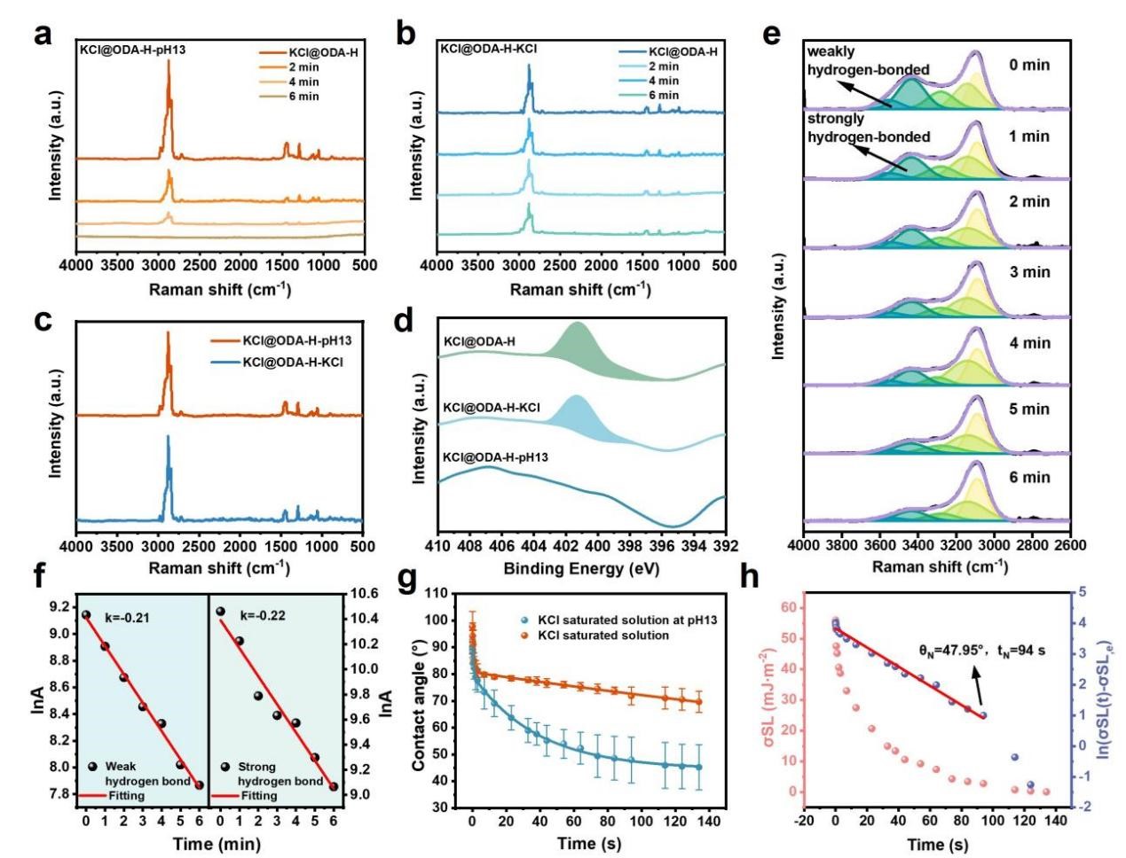 另一項(xiàng)工作則通過以堿度調(diào)控方式提高ODA-H的原位脫附效率,其KCl表面ODA-H的脫附率達(dá)到87%。MD模擬計(jì)算表明,OH?導(dǎo)致親水基團(tuán)(-NH3+)去質(zhì)子化,破壞了ODA-H與KCl表面之間的靜電相互作用,并在堿性條件下促使親水基團(tuán)脫離KCl表面。該機(jī)制可通過以下三個(gè)遞進(jìn)階段系統(tǒng)闡明:(1)OH?誘導(dǎo)ODA-H脫附;(2)固–液界面張力降低;(3)擴(kuò)散過程加速,從而促進(jìn)OH?向吸附位點(diǎn)的高效傳輸。