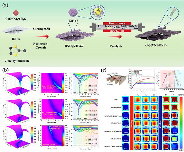 圖1.(a) Co@CNT/BNF復(fù)合材料制備示意圖;(b) 吸波性能和(c) 導(dǎo)熱性能。
