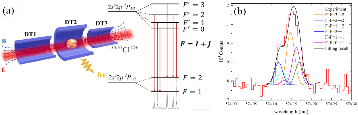 由于高電荷態(tài)離子制備條件苛刻、多電子體系能級結構復雜,對其開展高精度實驗測量長期面臨較大的技術挑戰(zhàn)。研究團隊依托高溫超導電子束離子阱(EBIT)實驗平臺,首次成功觀測到類硼氯離子(Cl12+) 中2P1/2和 2P3/2能級的超精細分裂結構,并通過高分辨譜線擬合獲得了相應的超精細結構常數,利用第一性原理理論計算,成功提取該離子原子核的磁偶極和電四極超精細結構常數。該工作為中等原子序數高電荷態(tài)離子超精細結構的理論研究提供了重要實驗基準。