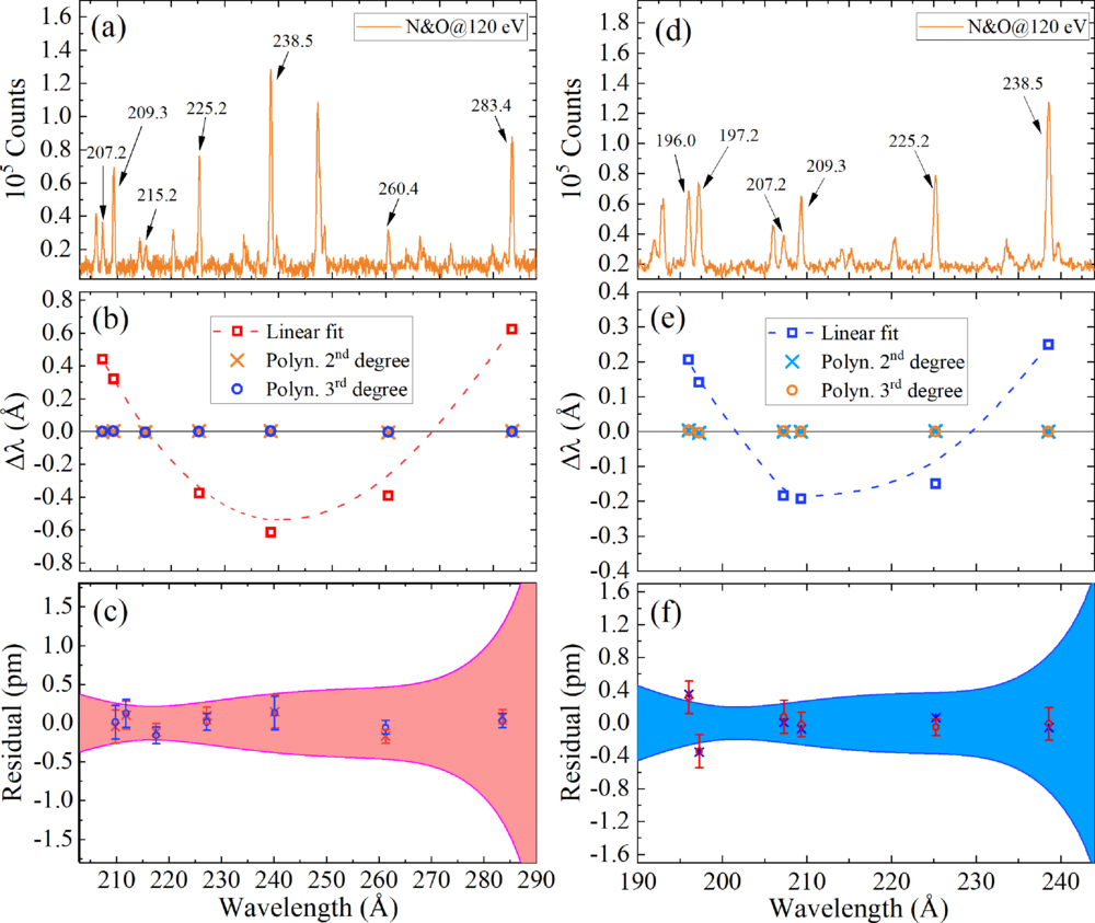 圖2. (a, d)分別為類鈹 S12+和Cl13+離子的校刻光譜;(b, d)分別為S12+和Cl13+離子的離子色散函數的殘差圖;(c, f) 為殘差放大圖和1-σ置信區(qū)間;
