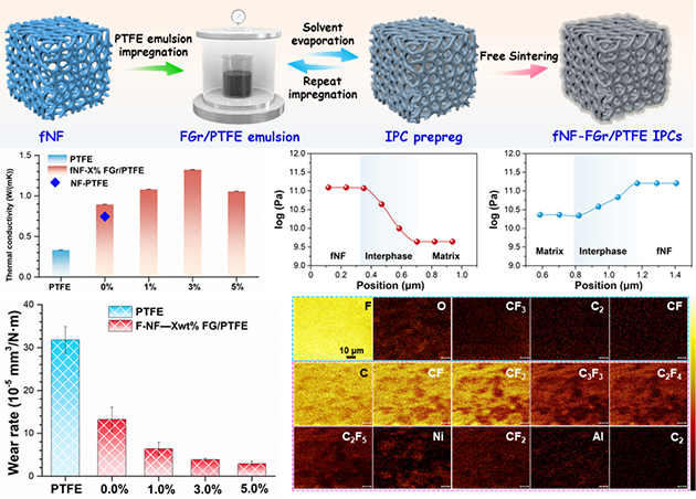 針對泡沫金屬與聚四氟乙烯異質(zhì)界面結(jié)合弱的問題,研究人員采用氟硅烷偶聯(lián)劑對泡沫鎳三維連續(xù)界面進(jìn)行液相氟化改性,同時在基體中引入少量氟化石墨。結(jié)果表明,界面-基體“雙氟化”的設(shè)計有效增強(qiáng)了泡沫鎳與聚四氟乙烯之間的界面結(jié)合,從而抑制外力拉伸時的變形與裂紋擴(kuò)展;少量氟化石墨的引入增強(qiáng)了PTFE連續(xù)相的硬度、模量,使得雙連續(xù)相復(fù)合材料的導(dǎo)熱系數(shù)提升至1.3 W/(m·K)。得益于由聚四氟乙烯、鎳磨屑與氟化石墨在金屬配副表面形成的復(fù)合摩擦轉(zhuǎn)移膜,進(jìn)一步改善了復(fù)合物的摩擦學(xué)性能,磨損率下降90.7%。相關(guān)研究結(jié)果發(fā)表在Composites Part B: Engineering(2025: 112816)上。