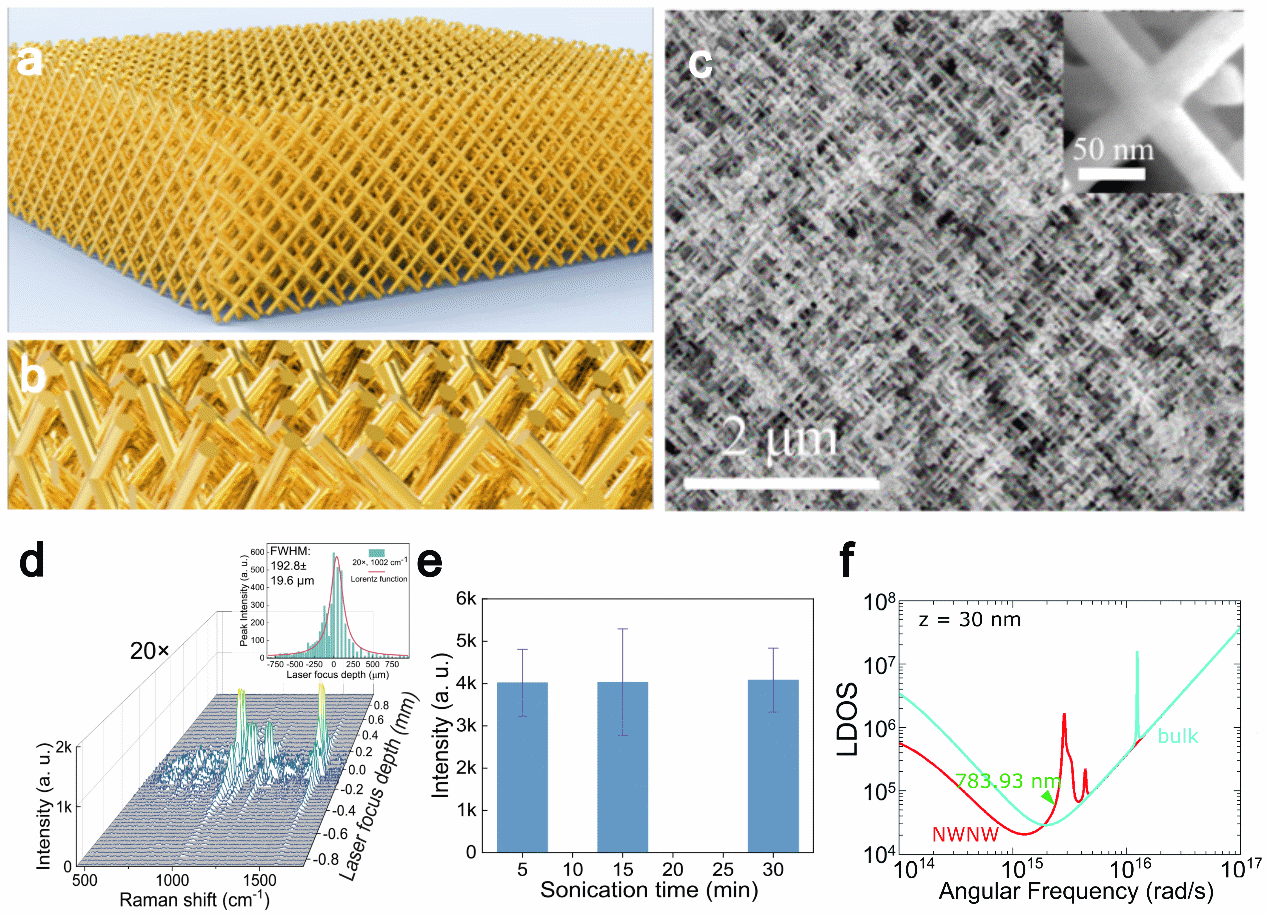 圖:具有聚焦容忍性和結構穩(wěn)定性的三維金納米網(wǎng)格SERS襯底:a-b基于離子徑跡技術制備的三維金納米線網(wǎng)格模型;c金納米線網(wǎng)格實物的掃描電鏡照片,納米線直徑為35 nm;d 三維襯底在20倍物鏡下能夠在離焦范圍192.8±19.6 μm內(nèi)保持50%的SERS信號;e 超聲水應力環(huán)境SERS穩(wěn)定性測試,在30分鐘超聲后仍能保持信號穩(wěn)定;f 有效介質(zhì)模型反映出納米線網(wǎng)格結構在激發(fā)光附近的高局域態(tài)密度。