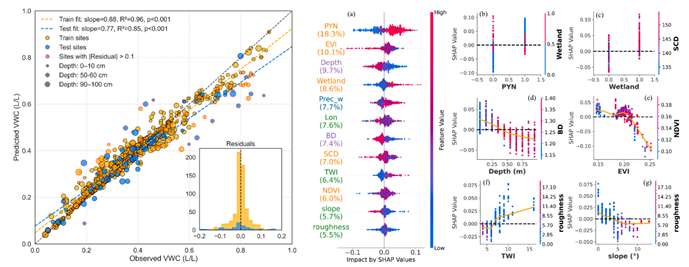 該數(shù)據(jù)產(chǎn)品表現(xiàn)優(yōu)異(R2 = 0.85, RMSE = 0.08 L/L),能精準(zhǔn)刻畫(huà)凍土與濕地共同塑造的“河谷濕潤(rùn)走廊”及干燥高地的空間分異,彌補(bǔ)了SMAP等全球粗分辨率產(chǎn)品難以解析深層與亞公里尺度異質(zhì)性的不足,為寒區(qū)流域水文模擬與生態(tài)管理提供了可移植的制圖方案與高精度基礎(chǔ)數(shù)據(jù)。