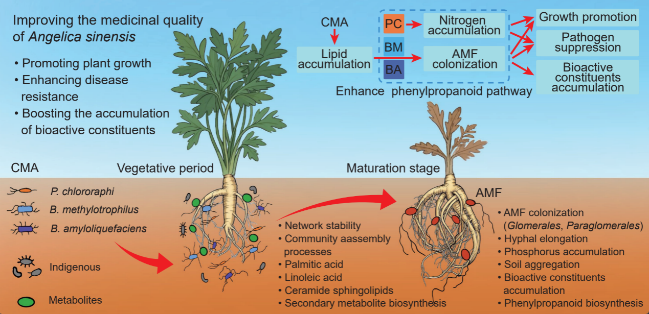 兩項(xiàng)研究分別從激素與苯丙烷代謝調(diào)控以及“功能互補(bǔ)菌群—AMF協(xié)同作用”兩個(gè)層面,揭示了微生物介入對(duì)當(dāng)歸生長和藥用成分積累的調(diào)控機(jī)制,為“生防菌調(diào)控—宿主響應(yīng)—品質(zhì)形成”提供了重要的實(shí)驗(yàn)依據(jù),并為相關(guān)機(jī)制研究奠定了堅(jiān)實(shí)基礎(chǔ)。