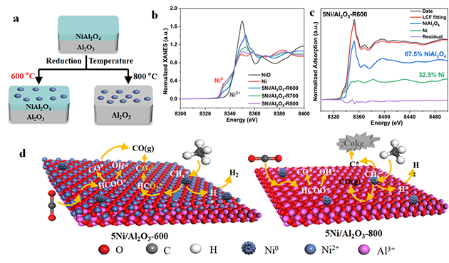 圖1.(a) Ni0/NiAl2O4/Al2O3制備示意圖; (b) 各還原溫度下的催化劑歸一化Ni K-edge XANES光譜;(c) 5Ni/Al2O3-R600的線性組合擬合(LCF)結果;(d)催化劑5Ni/Al2O3-600和5Ni/Al2O3-800的DRM反應機理示意圖