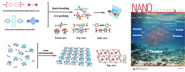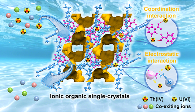 針對(duì)上述技術(shù)瓶頸,中國(guó)科學(xué)院蘭州化學(xué)物理研究所天然藥物與化學(xué)測(cè)量研究中心高效分離與資源利用課題組原創(chuàng)提出 “離子有機(jī)單晶” 新概念,該類有序晶態(tài)材料是由有機(jī)陰、陽(yáng)離子配體經(jīng)離子自組裝策略綠色合成,兼具單晶結(jié)構(gòu)可精準(zhǔn)解析、孔道微環(huán)境可精細(xì)調(diào)控、功能基團(tuán)可靈活設(shè)計(jì)等獨(dú)特優(yōu)勢(shì),為復(fù)雜體系中核素的高效分離提供了全新的研究思路。目前,課題組已實(shí)現(xiàn)羧基、磺酸基、季鏻(銨)、膦酸基系列離子有機(jī)單晶的可控構(gòu)筑,并在鈾(U (VI))、釷(Th (IV))、碘等典型核素的高效分離方面取得系列創(chuàng)新性研究進(jìn)展。