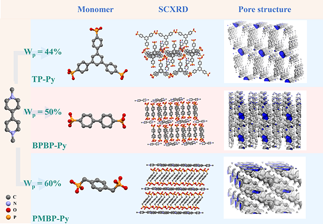 釷作為一種天然存在的放射性金屬,被譽(yù)為第四代核能系統(tǒng)的理想燃料。然而,其常與稀土元素伴生于獨(dú)居石等礦物中,分離極具挑戰(zhàn)。研究人員受自然界中富含釷的獨(dú)居石(磷酸鹽礦物)啟發(fā),采用含有蒽環(huán)的吡啶陽(yáng)離子配體與二膦酸陰離子配體自組裝合成了膦酸功能化離子有機(jī)單晶(圖1,入選期刊內(nèi)封面)。研究表明,該材料對(duì)水溶液中Th(IV)的飽和吸附容量可達(dá)456mg/g,在多金屬共存、甚至真實(shí)海水體系中仍可保持極高的選擇性和穩(wěn)定性,研究成果發(fā)表在Nano Letters(2025, 25, 7665)上。進(jìn)一步通過(guò)調(diào)控膦酸基數(shù)量和苯環(huán)含量,構(gòu)筑了TP-Py、BPBP-Py和PMBP-Py三類膦酸功能化離子有機(jī)單晶(圖2),其中BPBP-Py的Th(IV)富集能力達(dá)到467mg/g,Th/U分離系數(shù)為6.77,并兼具良好的熱穩(wěn)定性和循環(huán)使用性能。機(jī)理研究表明,吸附過(guò)程中,膦酸基起主要作用,其中O作為關(guān)鍵吸附位點(diǎn),不僅影響最終吸附效果,還影響材料的親疏水性能和分散性,研究成果發(fā)表在ACS Applied Materials & Interfaces(2025, 17, 69807)上。