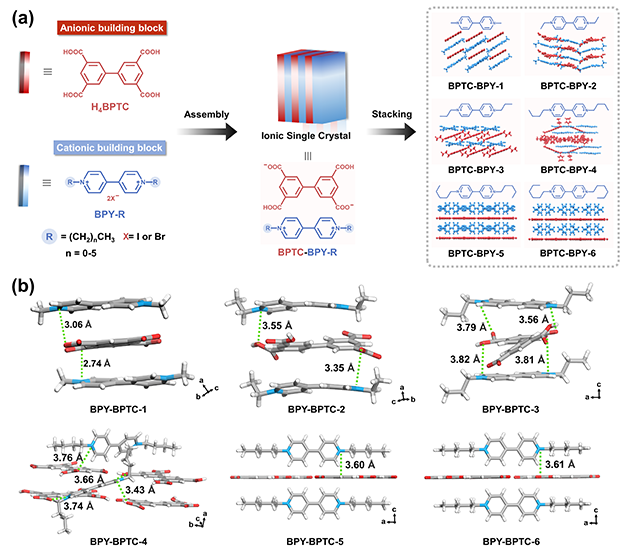 圖5.(a)BPTC-BPY-R(R=1-6)系列羧基離子有機(jī)單晶的合成及(b)H4BPTC與BPY-R之間的離子鍵
