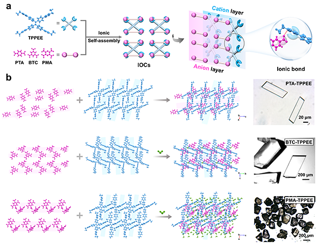 圖6. PTA-TPPEE、BTC-TPPEE和PMA-TPPEE三種羧基離子有機(jī)單晶的合成及光學(xué)顯微鏡表征