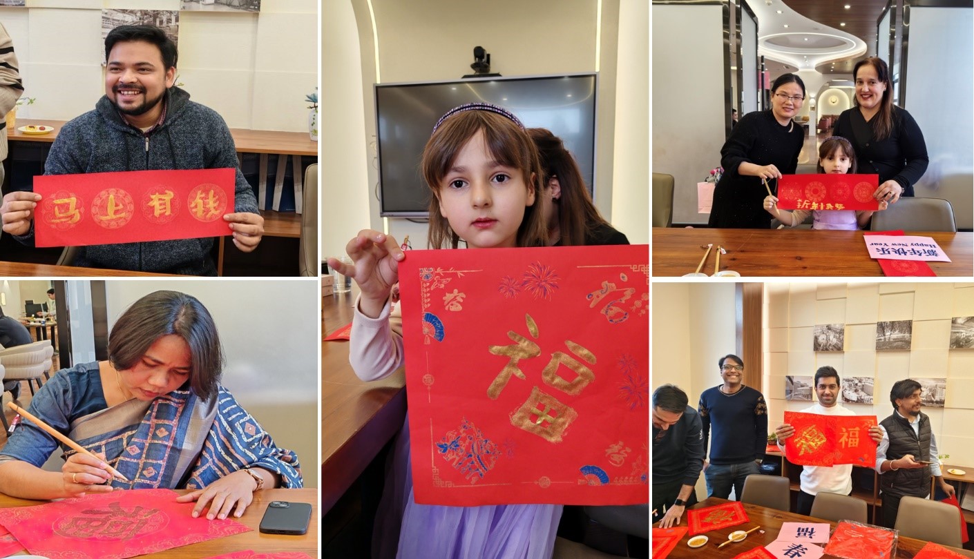活動(dòng)精彩紛呈,在充滿墨香的中國(guó)傳統(tǒng)書(shū)法體驗(yàn)區(qū),外籍人員及家屬饒有興致地駐足打卡 “福字”、“對(duì)聯(lián)”書(shū)寫(xiě)活動(dòng),一對(duì)對(duì)春聯(lián)、一個(gè)個(gè)福字躍然紙上,互道新年的美好祝福,近距離體驗(yàn)中華傳統(tǒng)文化魅力。