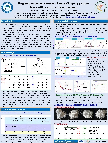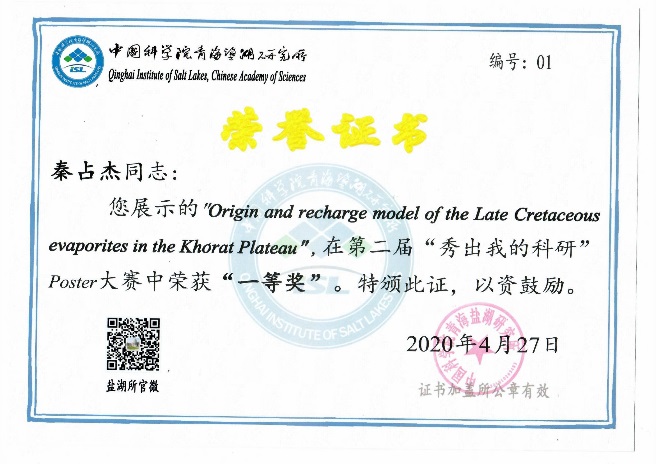 經(jīng)過專家評審和網(wǎng)絡(luò)投票,最終秦占杰博士《Origin and recharge model of the Late Cretaceous evaporites in the Khorat Plateau》和彭嬌玉博士《Research on Boron Recovery from Sulfate-type Saline Lakes with a Novel Dilution Method》,王廣國同學(xué)《Structure Study of Aqueous CaCl2 Solutions by Molecular Dynamics Simulations》和高靖易同學(xué)《Prehistoric human Activity and its Environmental Background in Lake Donggi Cona Basin, Northeastern Tibetan Plateau》分別斬獲大賽職工組和研究生組一等獎(jiǎng);高春亮博士等6名同志獲得二等獎(jiǎng),孫艷霞博士等10名同志獲得三等獎(jiǎng),本屆大賽為獲獎(jiǎng)?wù)咴O(shè)計(jì)了精美的證書。